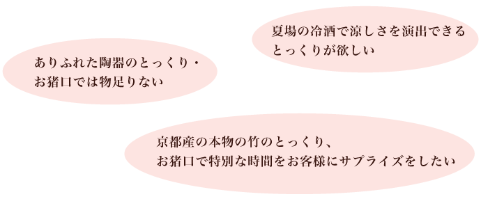 とっくり、お猪口も国家資格である竹工芸技能士一級で、京の名工(京都符伝統産業優秀技術者)にも選ばれている三島と京もの認定工芸士(京銘竹)の真下による手づくり。