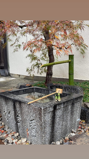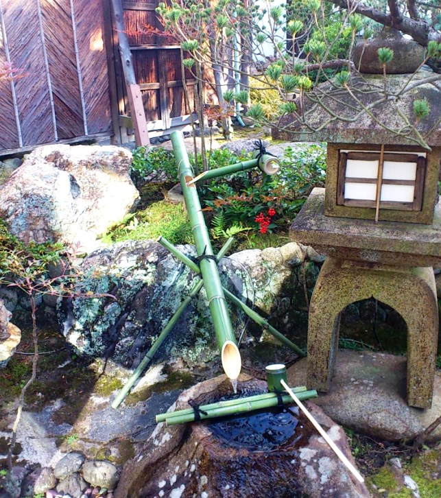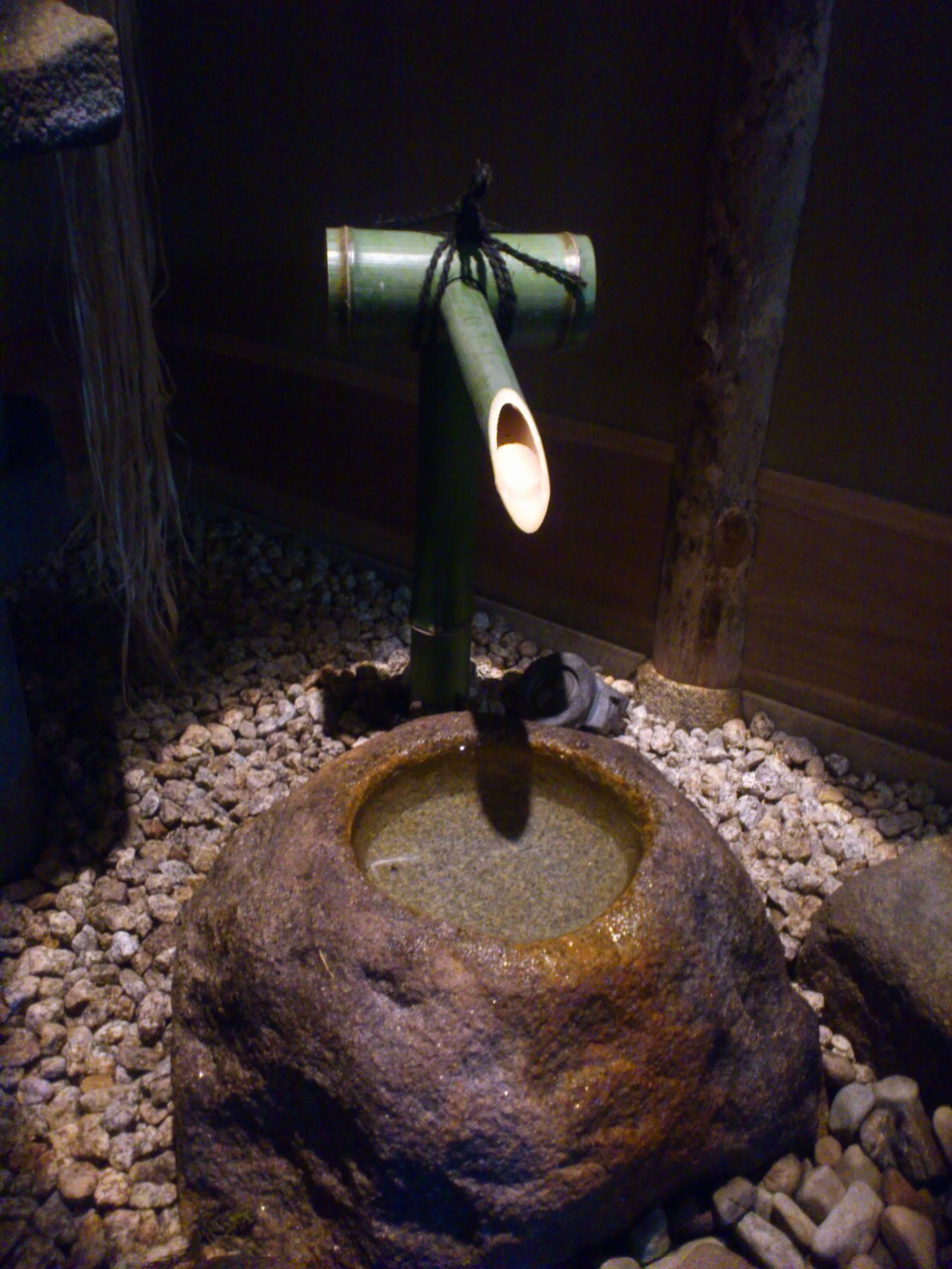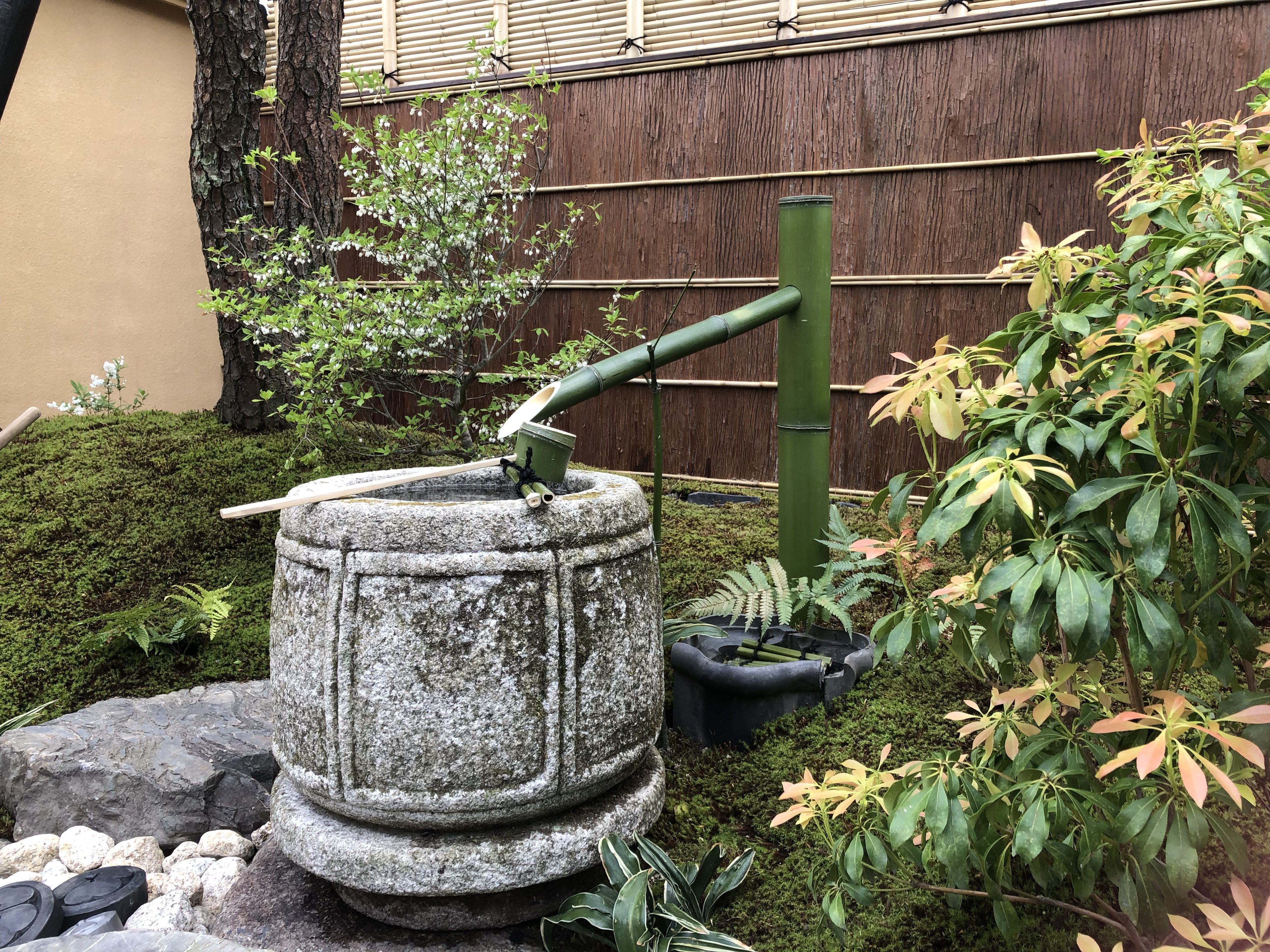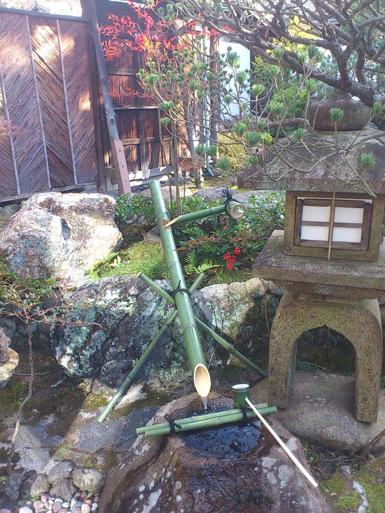 蹲(つくばい)の水口に設置し、杓や杓置きと共に蹲を飾り、お客様をお出迎えします。