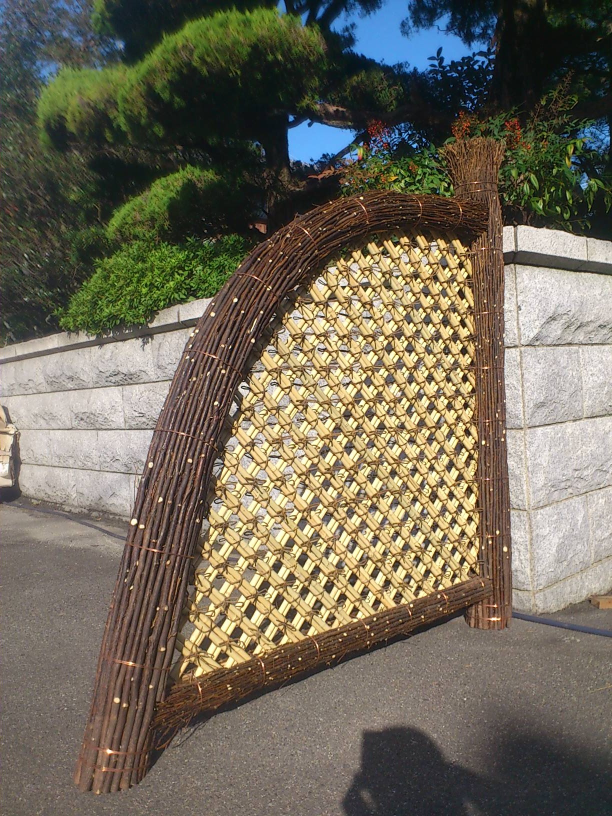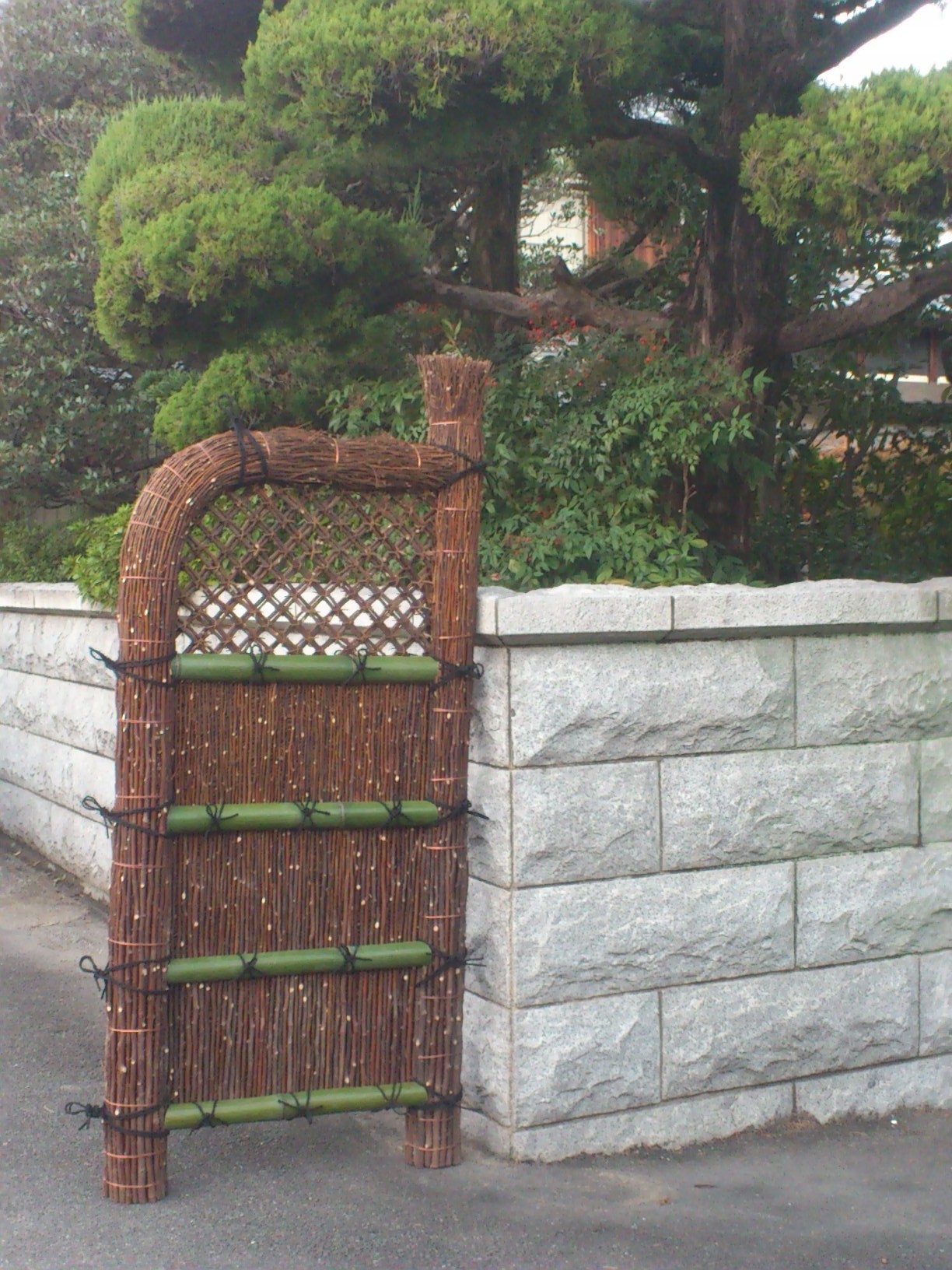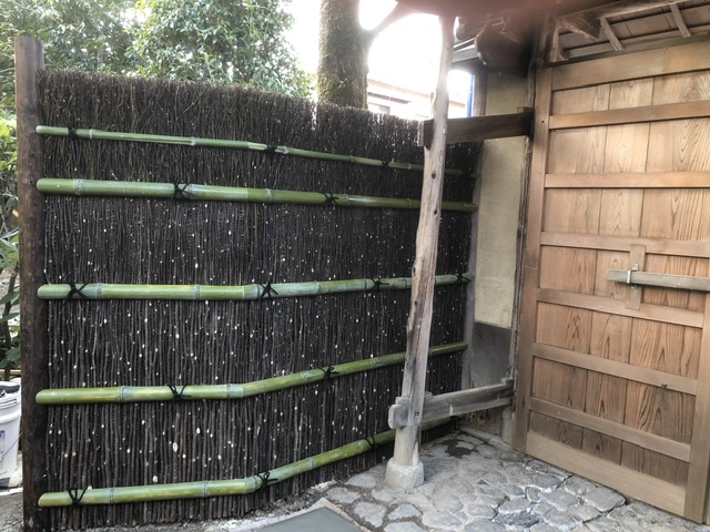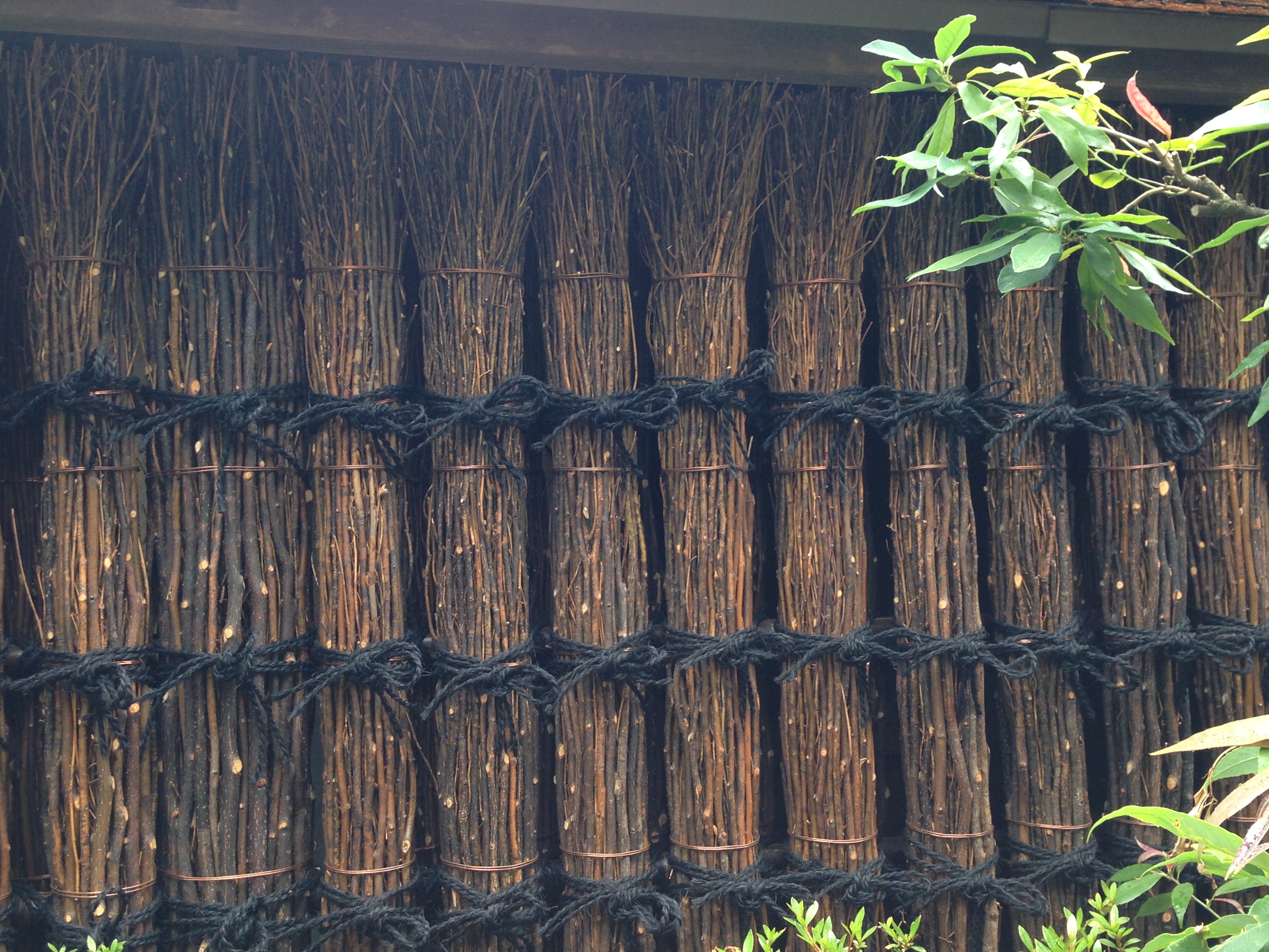 一般的に黒文字と言えば、薫り高い爪楊枝のイメージがありますが、竹垣でも黒文字を使用した垣があります。その黒文字を使用した竹垣は最高級品の一つでもあります。職人が黒文字の軸を一本一本枝打ちをして、丁寧に火であぶりながら真っすぐに伸ばして作る手間暇のかかった垣です。素材の持つ気品さと、職人の技が詰め込まれた垣は高貴な趣と力強さが表現され、庭のなかでも圧倒的な存在感を醸し出します。