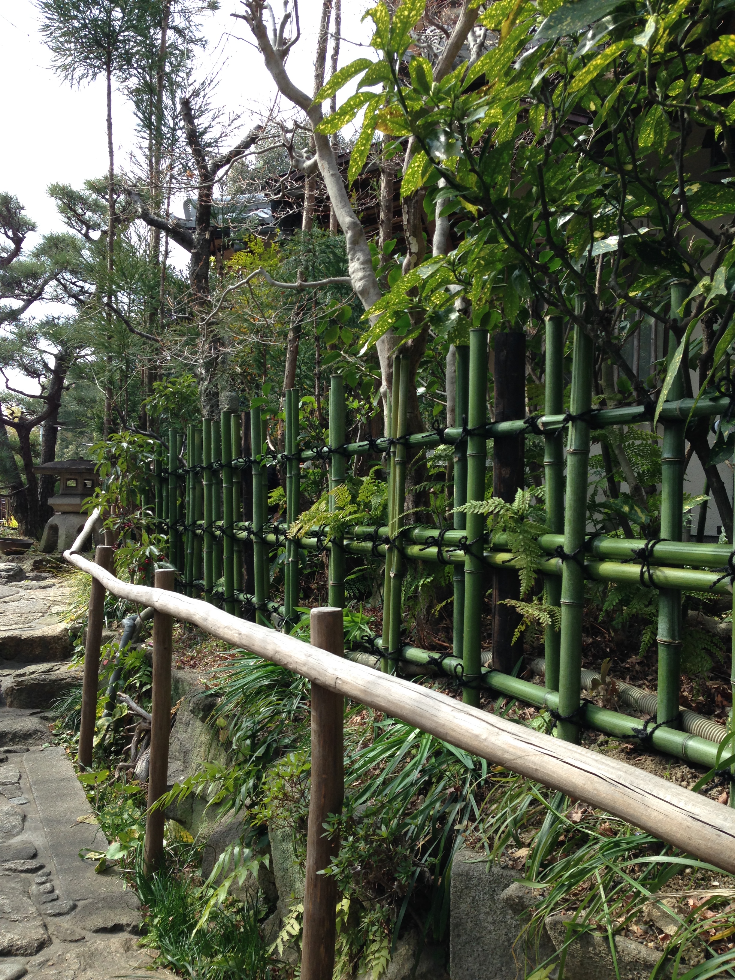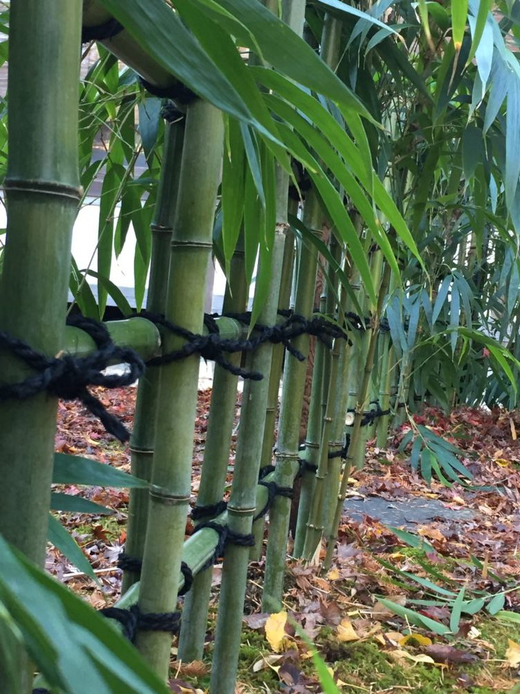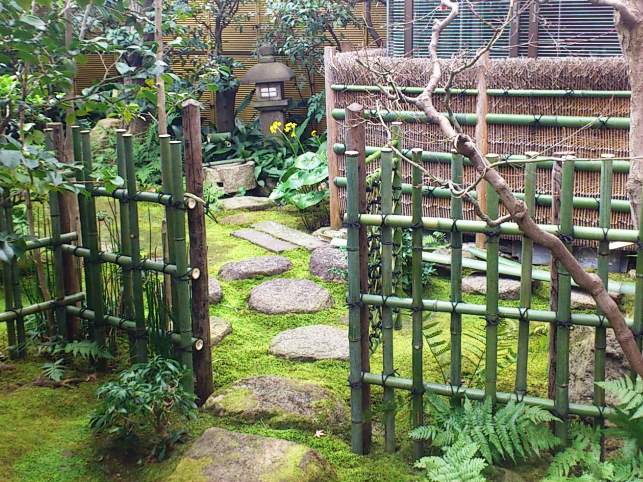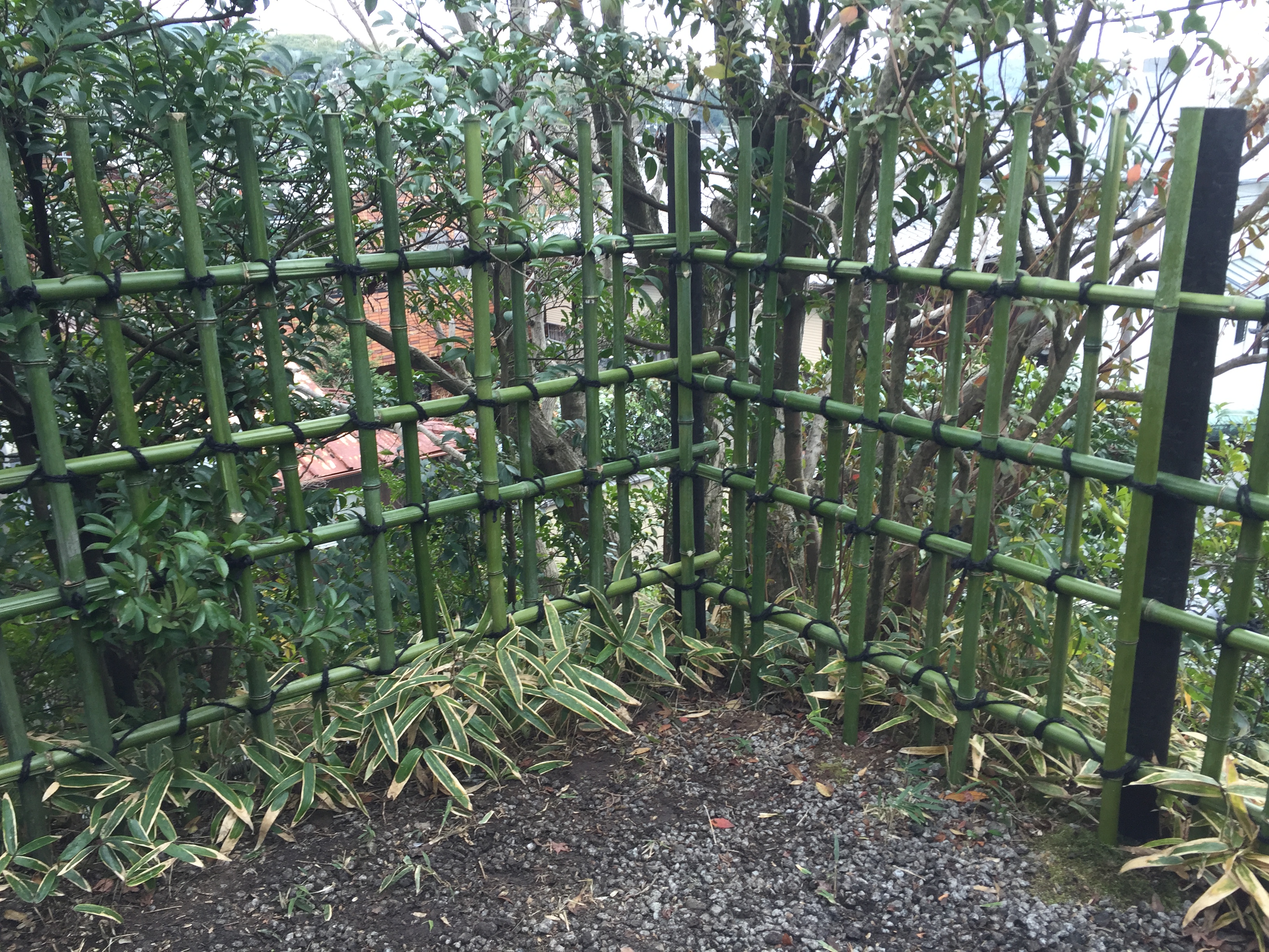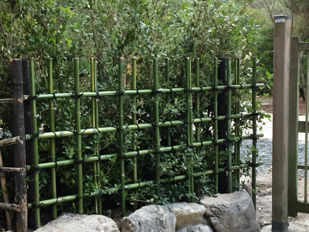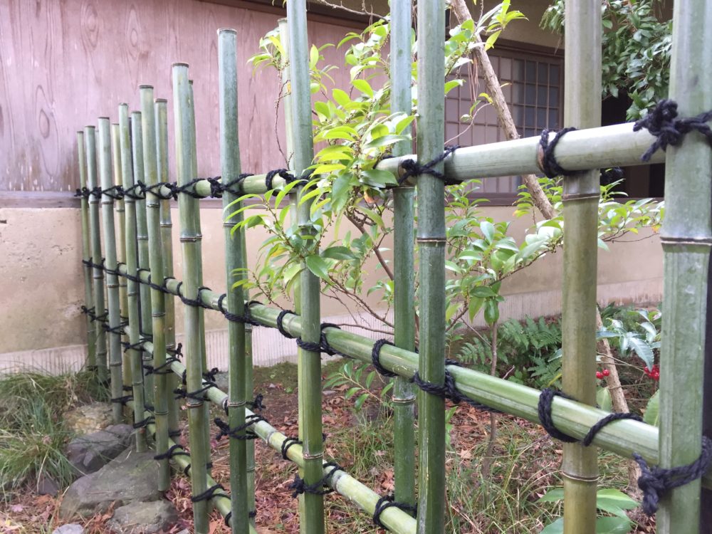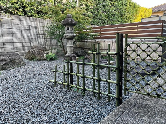 最も一般的な透かしが垣で庭以外にも公園や広場など様々なところで見られます。丸竹を四ツ目に組むだけの飾らない形状で、どこにでも合うことから幅広く利用されています。簡単な作りですが、様々なアレンジの仕方があり、変化の楽しめる垣です。