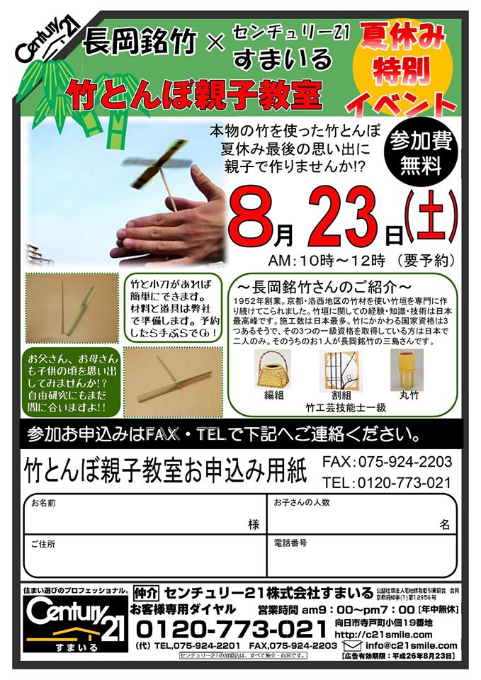 阪急電鉄 東向日駅すぐの<センチュリー21すまいる>さんのスマイルカフェで『竹とんぼ親子教室』がセンチュリー21さんの企画で開催されます。