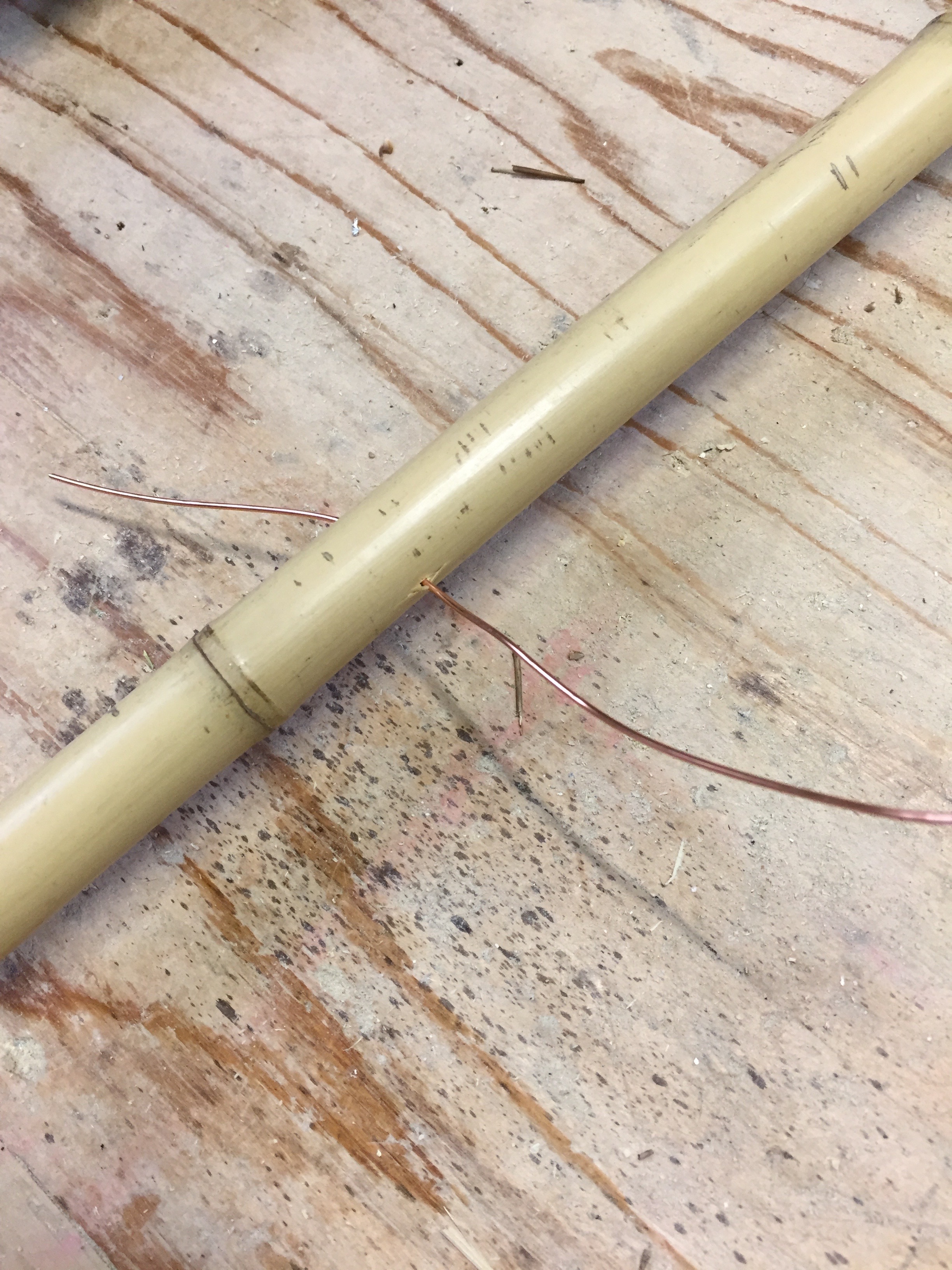 白竹にすべての銅線が通せたら、銅線を強く縛ります。