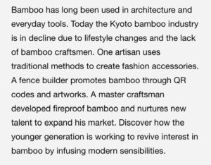 NHK WORLD-JAPAN(NHK国際放送)「Core Kyoto」にて、2020年4月2日「竹」をテーマにした回の中で、竹垣制作現場や「竹のQRコード」など弊社の行う「伝統と革新」の一部始終を紹介していただきます。