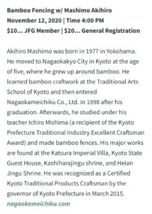 アメリカのサン・ディエゴにある日本庭園、サン・ディエゴ日本友好庭園のオンラインイベントで、弊社職人の真下彰宏が竹垣についての講演をさせていただきます。