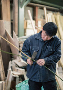 Akihiro Mashimo was born in 1977 in Yokohama. He moved to Nagaokakyo City in Kyoto at the age of five, where he grew up around bamboo. He learned bamboo craftwork at the Traditional Arts School of Kyoto and then entered Nagaokameichiku Co., Ltd. in 1998 after his graduation. Afterwards, he studied under his teacher Ichiro Mishima (a recipient of the Kyoto Prefecture Traditional Industry Excellent Craftsman Award) and made bamboo fences. His major works are found at the Katsura Imperial Villa, Kyoto State Guest House, Kashiharajingu shrine, and Heian Jingu Shrine. He was recognized as a Certified Kyoto Traditional Products Craftsman by the governor of Kyoto Prefecture in March 2015. nagaokameichiku.com