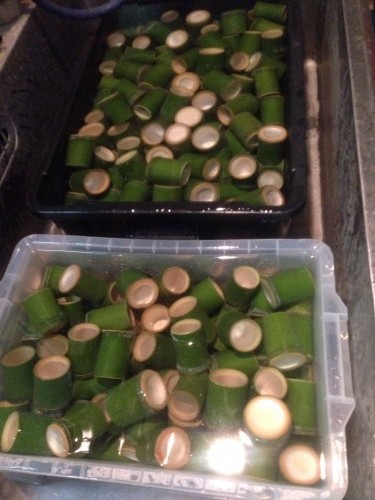 みなさん、月食はご覧になられましたか? 月食は偶然と偶然が重なり出来てます。きれいな月食にとても感動したお月見でしたね^_^ 今日は1日かけて、これだけの青竹のおちょこが出来ました!^ ^ 削りかすがフワフワの雪のように積もっています^_^ 雪といえば朝晩だんだん寒くなってきましたね(≧∇≦) みなさん、体調を崩しやすい時期ですので、風邪などひかれませんようにお気をつけください(^ー^)ノ